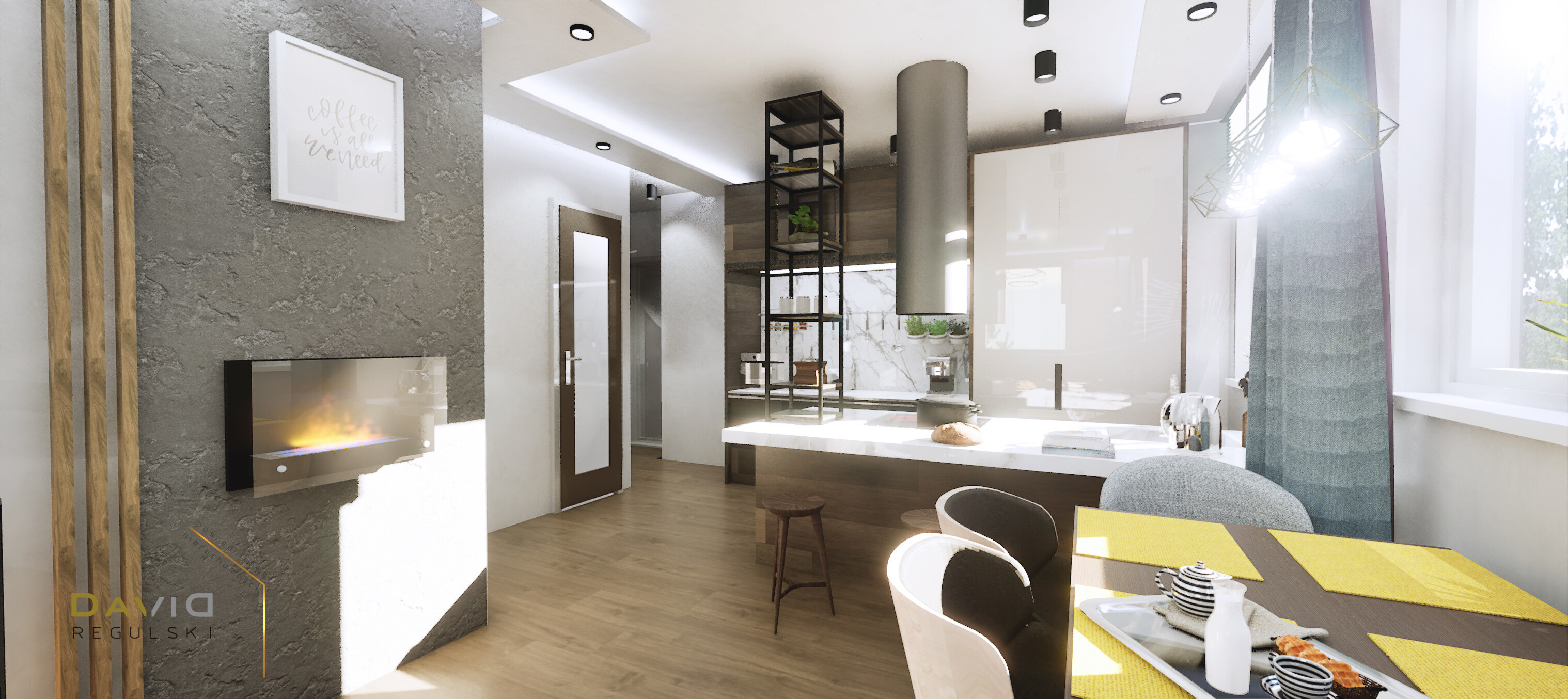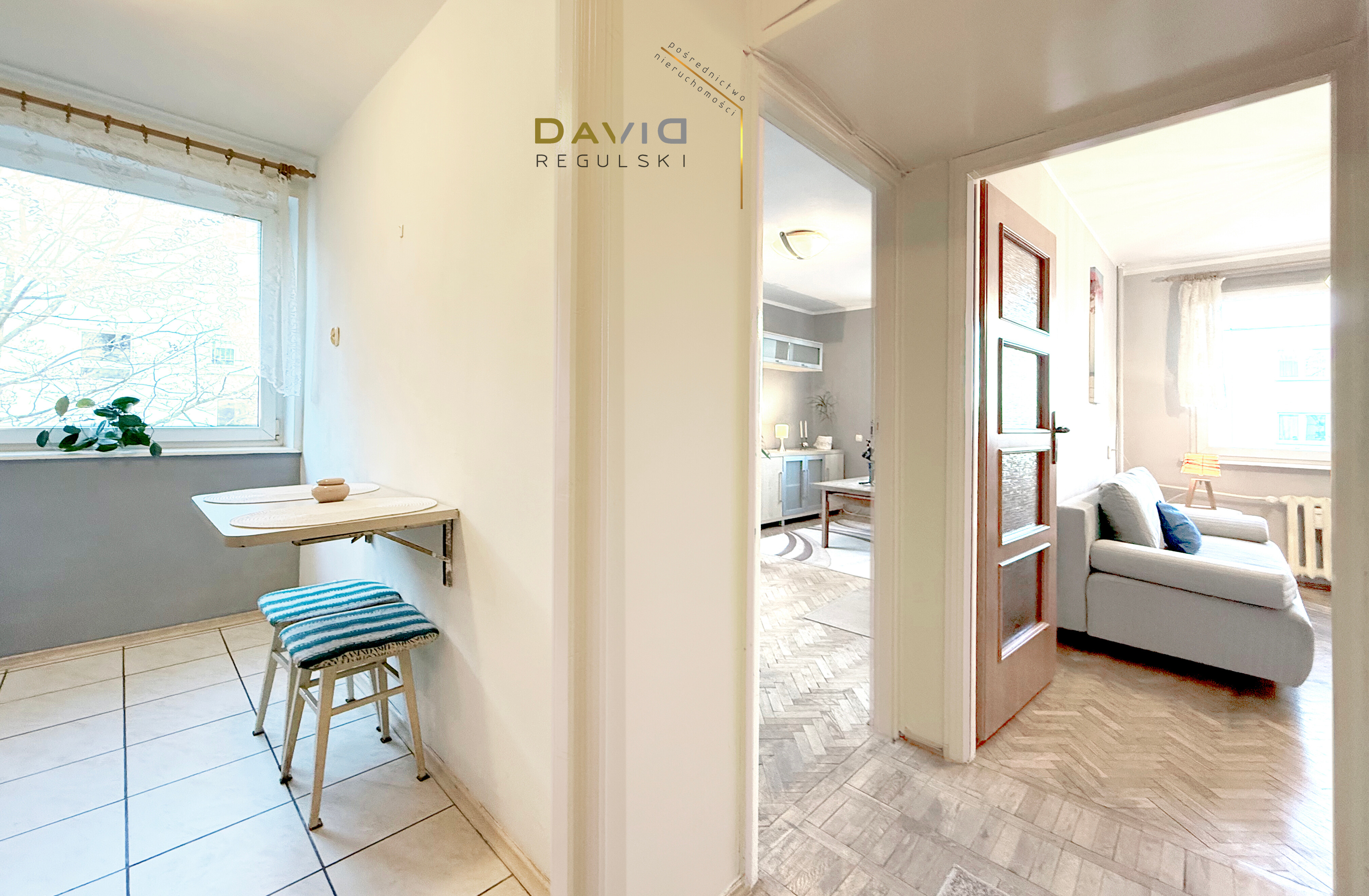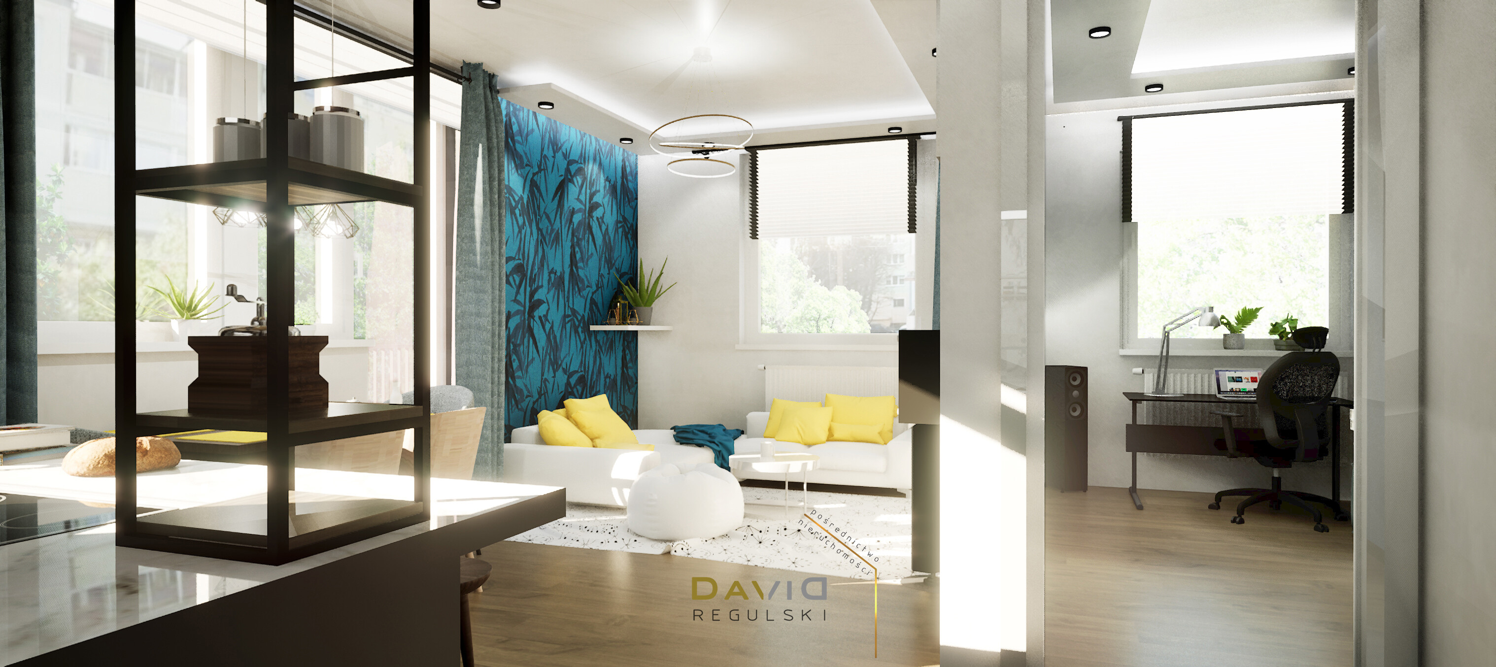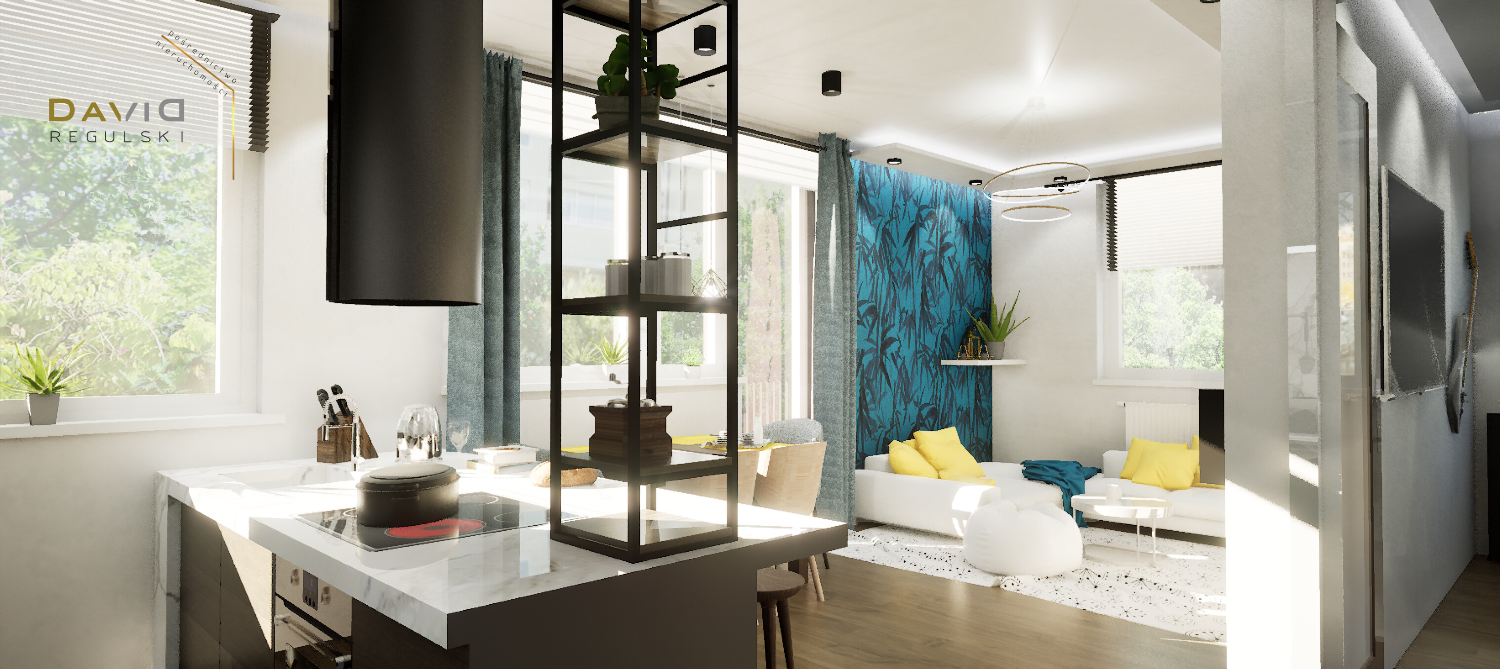 Atutem jest też bogata możliwość aranżacji układu pomieszczeń. Obecny stan zawiera dwa niezależne pokoje z odrębną kuchnią dostępne z jasnego przedpokoju. Dla zwolenników aneksu i wyspy kuchennej sporządziliśmy również wizualizację 3D układu alternatywnego, nadającego tonu nowoczesności z jeszcze większą ilością przestrzeni i światła.